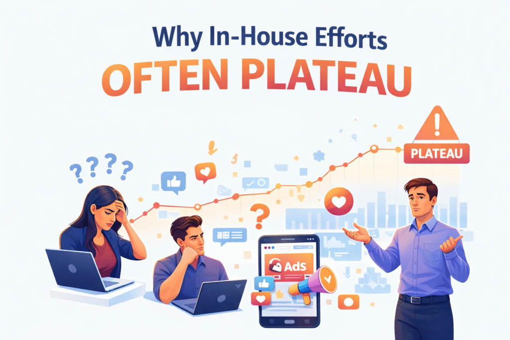 Many brands start META advertising in-house. While this works initially, performance often plateaus as competition increases.
